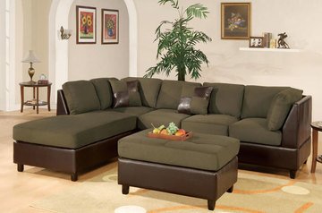 The Sacramento Sage Sectional Sofa by Urban Cali features a contemporary style with a sage and espresso upholstery. This sectional set includes a sofa and chaise, cocktail ottoman, and two throw pillows. This two-tone sectional sofa set is upholstered in soft microfiber and durable vinyl. Chaise is reversible during set-up allowing you to place it on the left or right side. Enjoy hosting your friends and family with this sectional in your living room.Please Note: This sofa includes a 1 year warranty on workmanship.